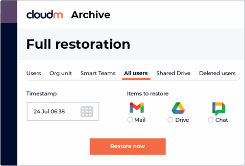 You can restore individual Mail or Drive data or choose bulk restore of the whole user, all Drive or all Mail data.