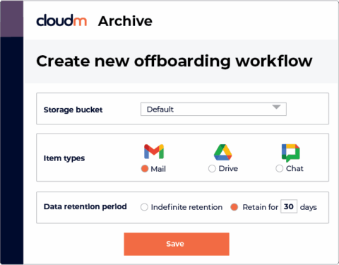 CloudM Archive is our dedicated solution for your ex-employees. With flexible retention policies, it is a cost-effective alternative to Google Archive User licenses that keeps you compliant with local data retention laws.